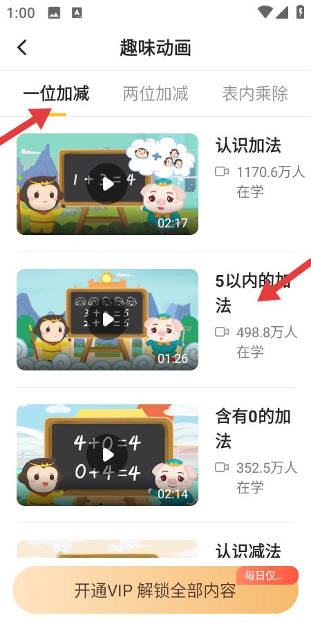 3、趣味動畫板塊按運算類型劃分一位加減主題下5 以內的加法等動畫展示,時長與學習人數標注,卡通角色講解,讓數學知識學習更輕松有趣。