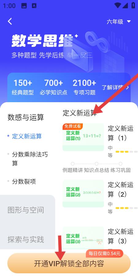 2、數學思維模塊圍繞題型構建定義新運算等專題羅列,免費試看內容供體驗,底部開通VIP提示醒目,助力用戶突破數學思維難題。