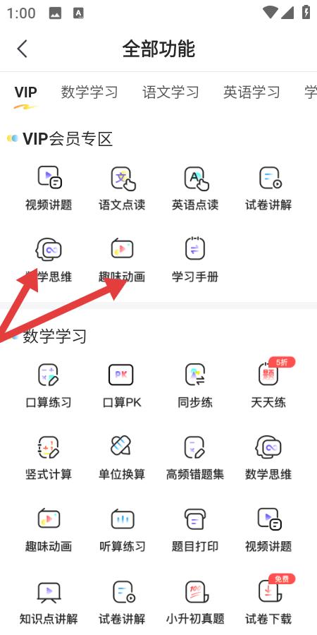 1、全部功能頁分類清晰VIP專區與學科學習板塊分明,數學學習里口算練習等工具豐富,趣味動畫和數學思維在兩區同步呈現。