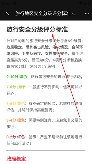 4、點擊評分標準選項進入旅行安全分級評分標準頁面,查看針對目的地的旅行安全分級評分包含的6個維度,以及不同分數段的安全級別說明。