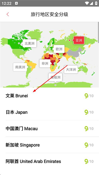 2、在旅行地區安全分級頁面,選擇文萊等目的地,查看其安全評分,如文萊安全評分。