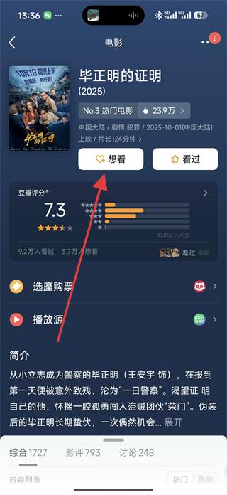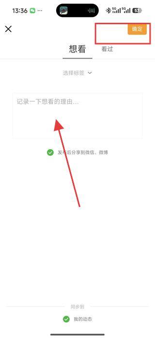 4、填寫完想看理由后點擊確定按鈕,完成電影的想看標記,方便后續查看和追蹤電影的動態,參與電影的互動討論。