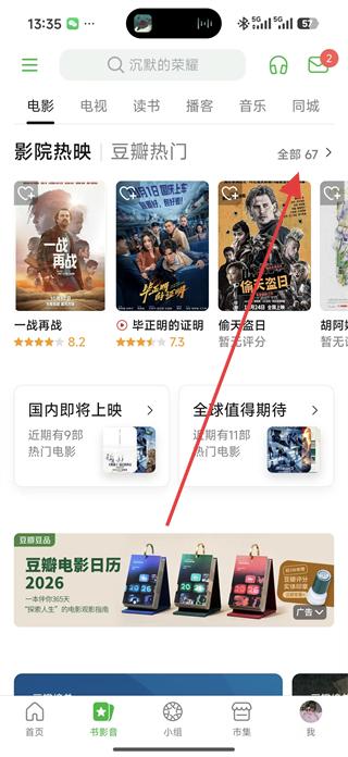 1、打開豆瓣app,進入首頁可查看影院熱映和豆瓣熱門的電影列表,點擊全部按鈕,進入熱門電影列表頁面,瀏覽更多電影內容。