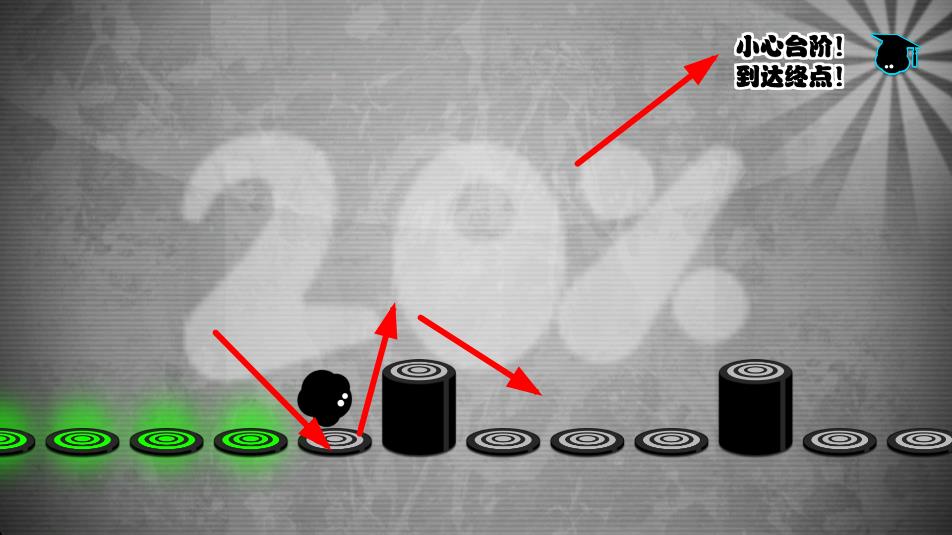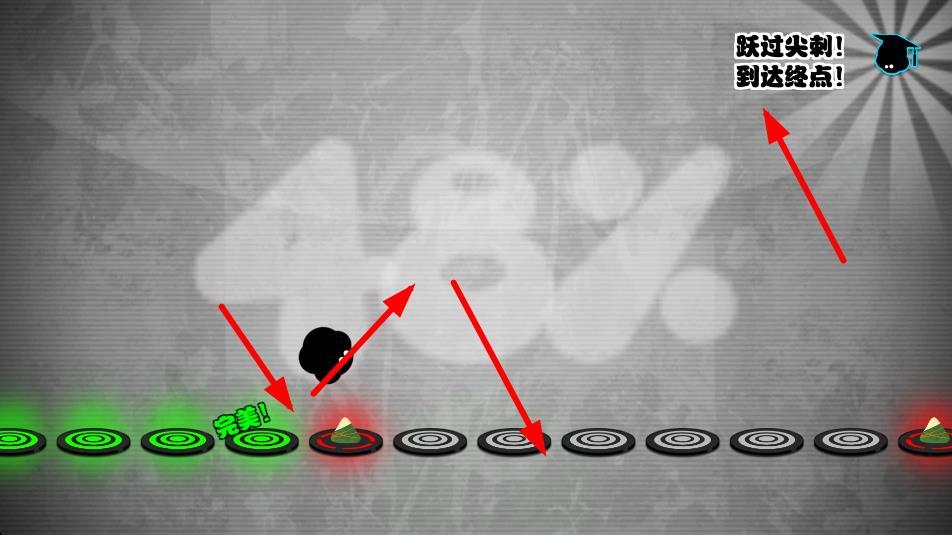 游戲的玩法很簡單,就是游戲開始后這個黑色的小家伙就會不斷的向前跳躍,當遇到紅色的釘刺或者高高的平臺時需要玩家快速的點擊屏幕來跳躍過去,節奏感很重要。這種玩法及操作都很簡單,但是游戲的難度可不是一般的高。游戲中的每一次跳躍都需要跟著游戲的節奏的拍子進行,稍微一下沒踩到點就準備身死道消吧。游戲中還時不時有那種柱子后馬上接個釘子的情形,簡直不讓人活了。