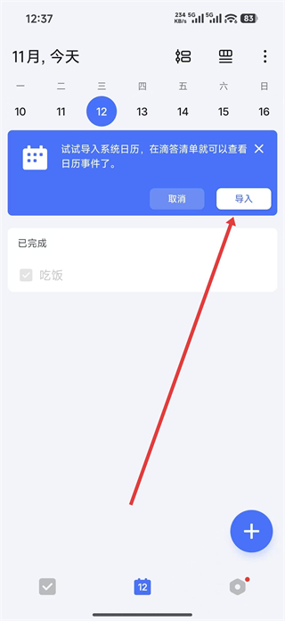 1、打開滴答清單app,進入日歷頁面,可看到導入系統日歷的提示,點擊導入,進入權限申請頁面。