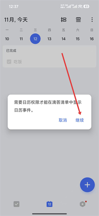 2、在權限申請頁面點擊繼續,授予APP日歷權限,以便在滴答清單中顯示日歷事件。