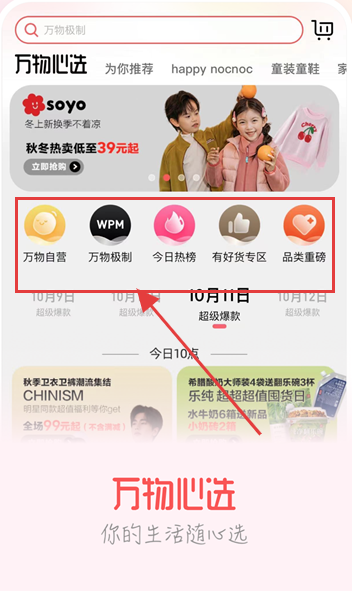 3、返回萬物心選app首頁,瀏覽萬物自營萬物極制等專區,按需點擊進入,挑選心儀的母嬰童裝等商品,開啟便捷購物體驗。