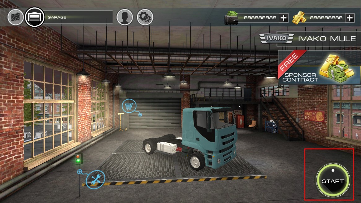 1、進入游戲會看到車庫界面,里面停著一輛藍色卡車,點擊右下角START按鈕,即可啟動卡車,開始駕駛任務。