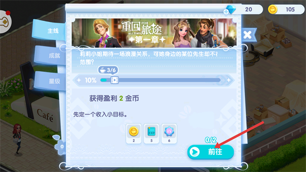 1、游戲有主線任務,比如重回旅途章節,可設定收入小目標,點擊前往推進任務,完成后能獲得金幣等獎勵。