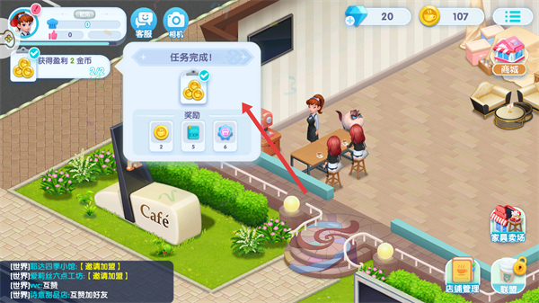 2、完成任務后會顯示任務完成,同時獲得金幣、道具等獎勵,這些獎勵可用于咖啡館的經營與發展。