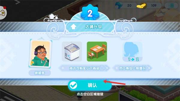 3、店鋪可進行升級,升級后能迎來新顧客,還可購買更多商品,員工等級上限也會提升,點擊確認完成升級。