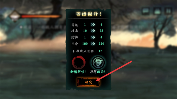 3、升級后會提升攻擊、防御、生命等屬性,還能獲得技能點,點擊確定按鈕繼續游戲。
