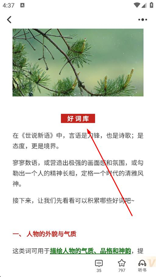 2、在素材詳情頁可查看好詞庫,學習世說新語中的優美詞匯,用于描繪人物氣質、營造畫面感等,提升作文語言表達。