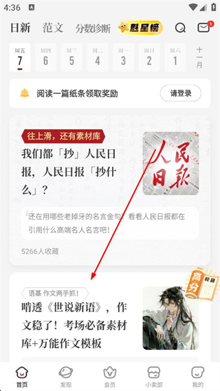 1、進入軟件首頁可查看各類作文素材推薦,如人民日報素材世說新語作文素材等,選擇感興趣的素材進入詳情頁。