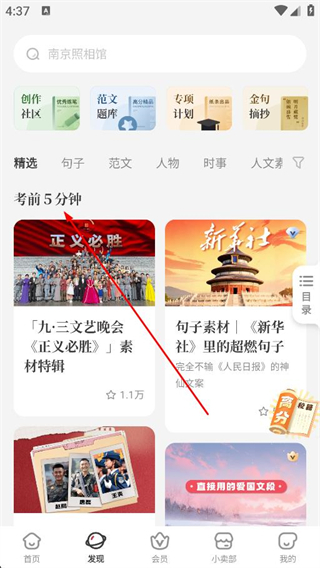 3、進入發現板塊可查看創作社區、范文題庫等分類,還有考前5分鐘的素材特輯,如九三文藝晚會素材,選擇素材進入詳情頁。