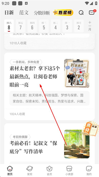 4、回到首頁瀏覽各類學習素材,如素材太老套?拿下這5個最新熱點,讓閱卷老師眼前一亮等內容,點擊可查看詳細素材,助力寫作提升。