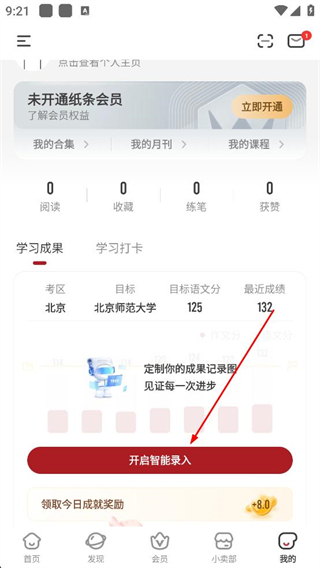 2、關閉簽到彈窗后在我的頁面找到開啟智能錄入按鈕,點擊該按鈕,可定制個人成果記錄,見證學習進步。