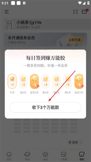 1、進入紙條APP我的頁面遇到每日簽到賺萬能膠彈窗,點擊收下3個萬能膠,領取每日簽到獎勵,積累萬能膠可兌換會員等權益。