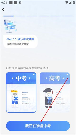 3、進入考試類型選擇頁面,根據自身情況在中考和高考中選擇,例如點擊我正在準備中考,確定考試類型以便獲取對應學習資源。