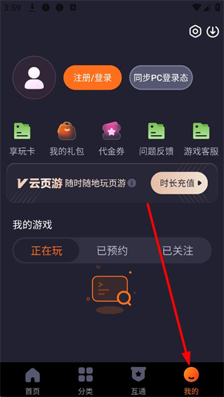 2、點擊我的入口,進入個人界面,可進行注冊、登錄操作,查看享玩卡、我的禮包等,還能管理我的游戲,查看正在玩、已預約等游戲狀態。