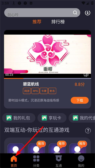 1、進入游戲平臺APP首頁,有推薦、排行榜板塊,展示如碧藍航線等游戲,還有我的禮包、享玩卡等功能入口,可瀏覽游戲或使用平臺功能。