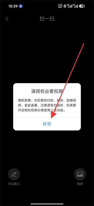 4、返回首頁點擊右上角掃一掃按鈕,若彈出請授權必要權限的提示,點擊好的按鈕,開啟相機權限。