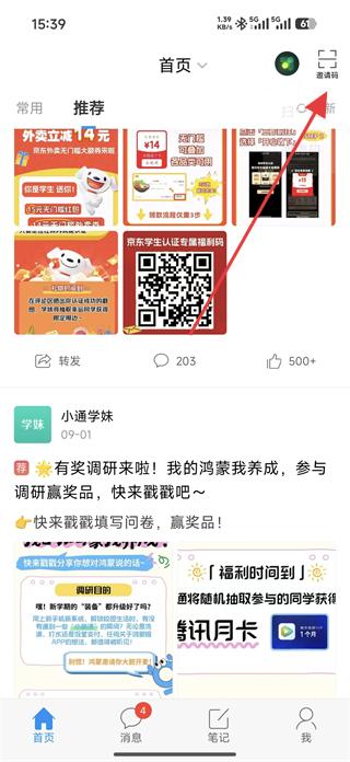 1、打開學習通軟件,進入首頁點擊右上角邀請碼按鈕,進入邀請碼輸入頁面。