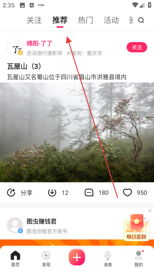 1、打開圖蟲,進入推薦頁面,瀏覽各類攝影作品動態,找到感興趣的攝影內容,點擊進入作品詳情界面,查看作品介紹、作者信息等內容。