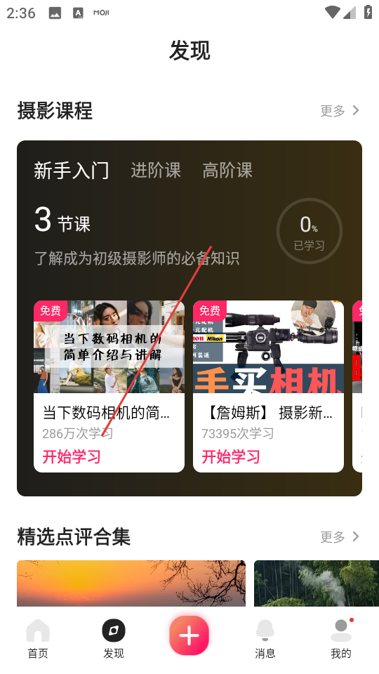 2、在APP底部點擊發現選項,跳轉至發現頁面,瀏覽攝影課程板塊,找到新手入門課程,點擊當下數碼相機的簡單介紹與講解課程,進入課程詳情頁。