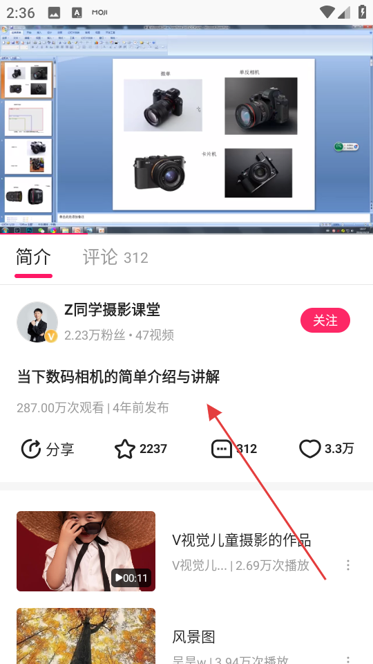 3、在課程詳情頁,查看課程簡介、播放量等信息,可選擇分享課程、收藏課程或參與評論互動,深入學習攝影知識提升技能。