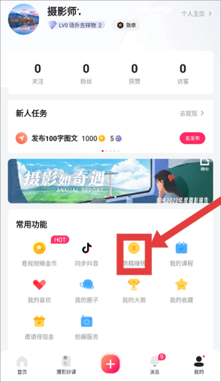 1、個人中心界面顯示攝影師昵稱及身份標識,有關注、粉絲等數量統計,新人任務鼓勵發布100字圖文獲獎勵。