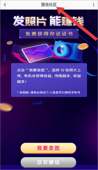 2、社區界面標題醒目提示發照片能賺錢并可免費獲存證,引導用戶點擊我要賣圖上傳照片獲取收益,強調傳圖數量與收益關聯。