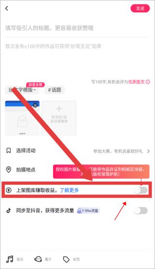 3、作品發布界面,提示填寫吸引人標題,強調首次發布100字作品得勛章,設有選擇活動等選項,紅框處上架圖庫賺取收益開關顯眼,鼓勵用戶將作品上架圖庫。