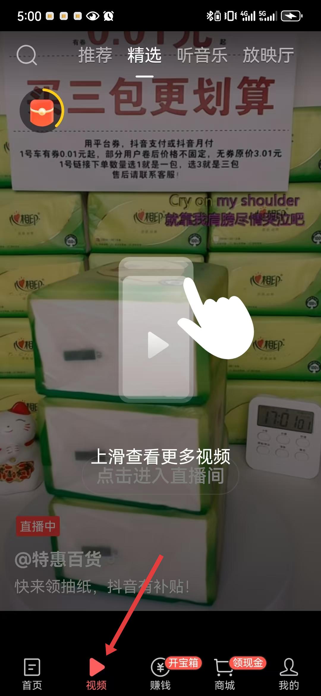 2、點擊底部視頻按鈕進入視頻頁面,有推薦、精選等分類,視頻內容豐富多樣,包括生活技巧、娛樂等,并且部分視頻還關聯直播,點擊可進入直播間。