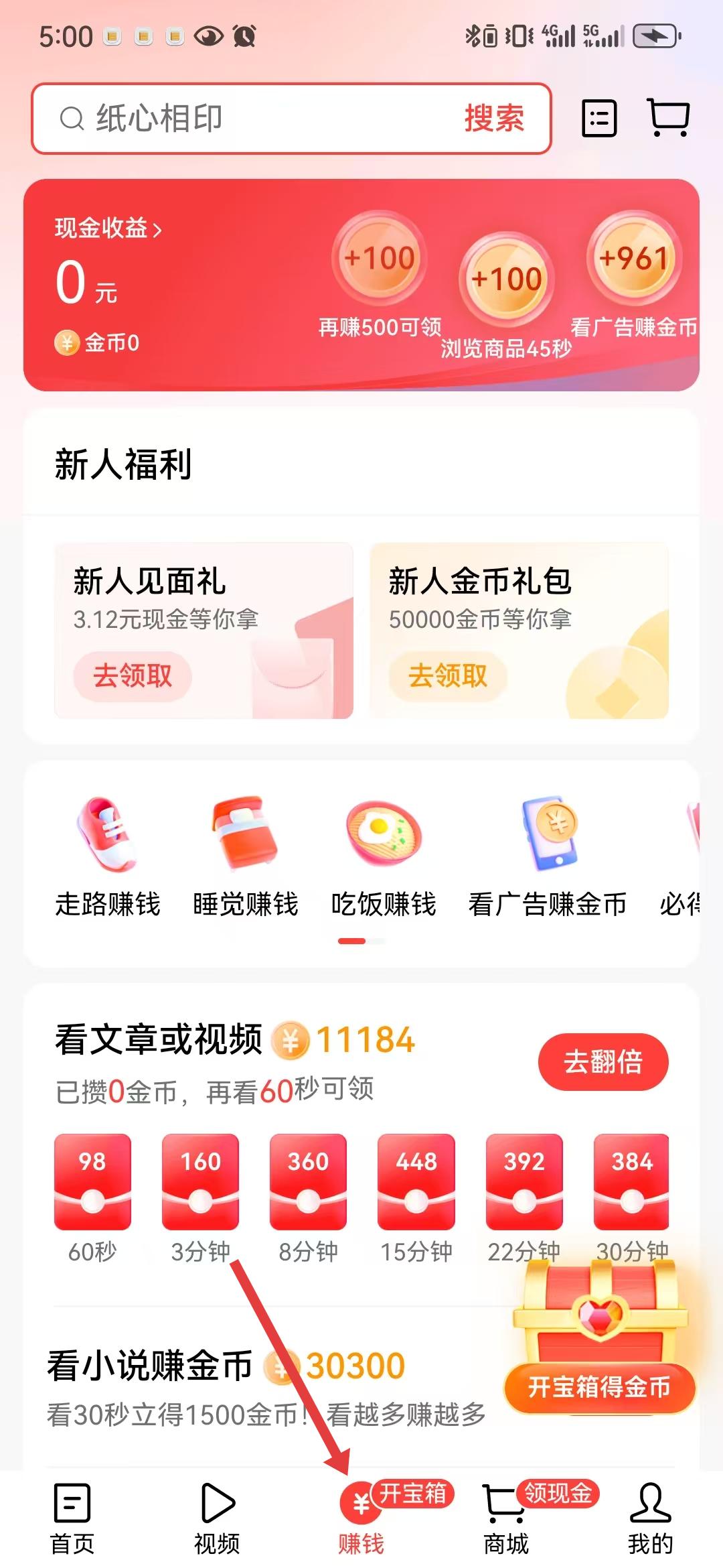 3、在底部點擊賺錢進入相關頁面,這里展示了多種賺取金幣的任務,通過完成這些任務用戶可以積累金幣并兌換現金,增添了使用過程中的趣味性和收益性。