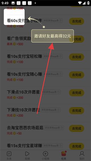 4、進入任務頁面可看到邀請好友最高得32元的提示,也可參與看60s支付寶小程序、看廣告領獎勵等任務,完成任務獲取金幣。