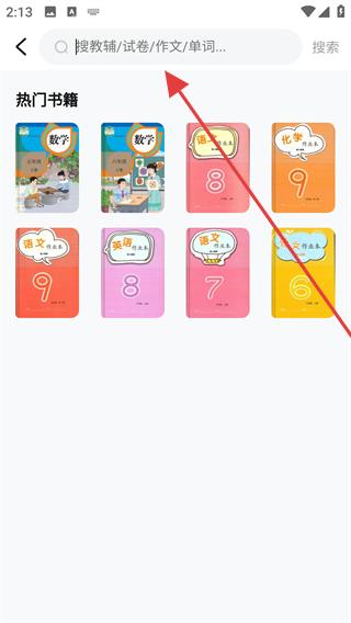 1、打開快對作業APP,在搜索欄輸入想要查找的教輔、試卷等相關內容,點擊搜索,查找目標教材或資料。