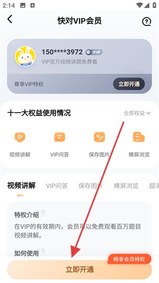 4、若想開通快對VIP會員,進入VIP會員頁面,查看會員權益,點擊立即開通,按提示完成會員開通流程,暢享會員特權。
