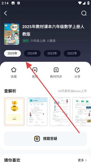 2、搜索到目標教材后進入教材詳情頁面,可選擇不同年份的教材版本,查看教材同步、解析等內容。