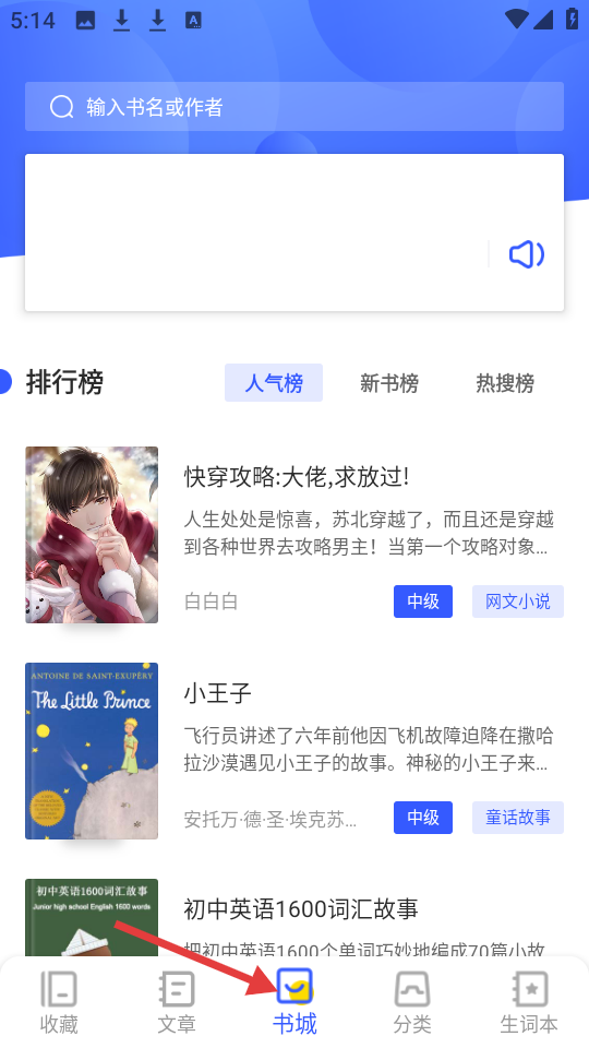 1、書城頁能搜書名作者,有排行榜,展示人氣書籍,如網文小說快穿攻略,還有童話小王子等。
