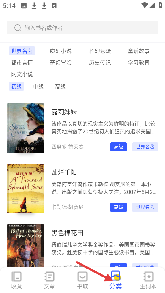 2、分類頁含多種題材,如世界名著、科幻懸疑等,按難度分級,呈現嘉莉妹妹等經典作品助用戶選書。