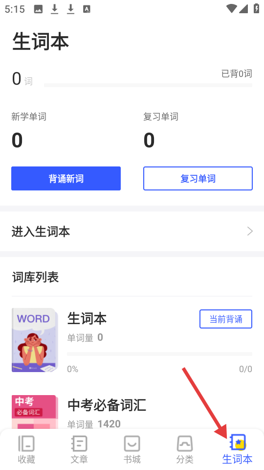 3、生詞本頁面可管理單詞,顯示新詞復習詞數量,有背誦復習功能,詞庫含中考必備等輔助英語學習。