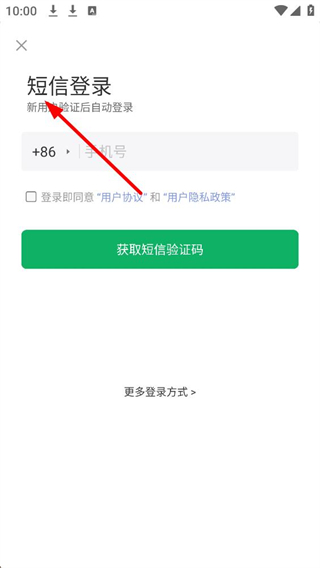 3、進入登錄界面,可選擇短信登錄方式,輸入手機號、獲取短信驗證碼,勾選登錄即同意用戶協議和用戶隱私政策后完成登錄。