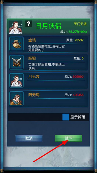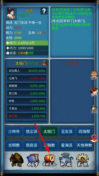 1、進入太極門等門派,查看可約戰的對手,了解其戰力等信息,為武俠對戰的挑戰選擇目標。