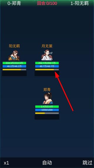 4、觀察對手的戰力和狀態,選擇合適的戰斗策略,如自動或跳過功能,推進武俠對戰的進程。