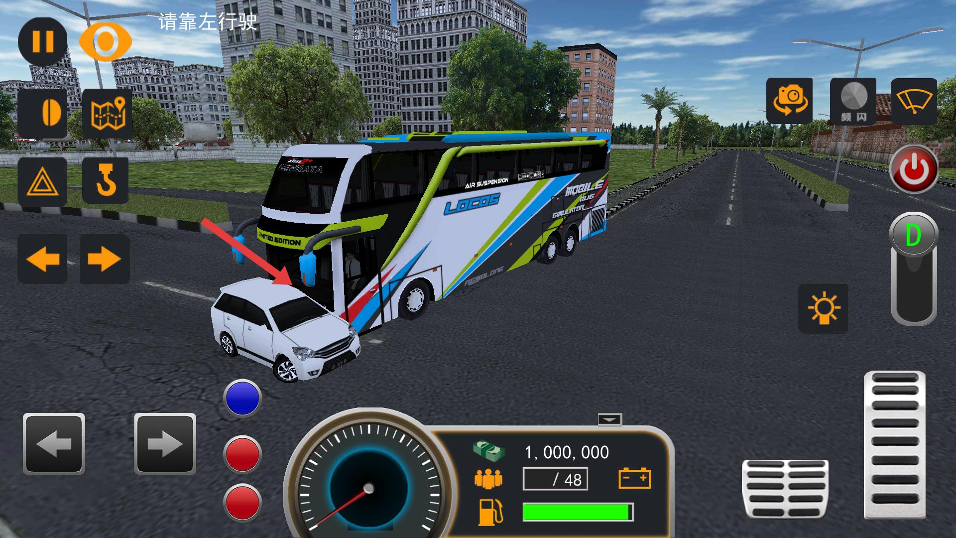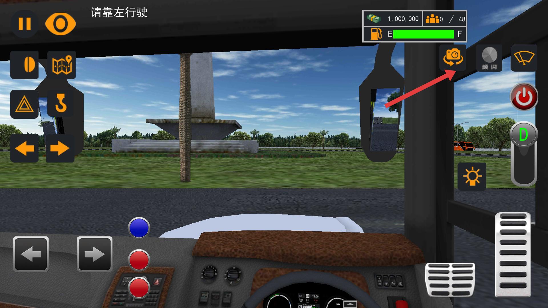 2、進入駕駛場景后,界面有方向控制和油門等按鈕,通過方向按鈕調整行駛方向,踩下油門按鈕,大巴車會前進,按提示靠左行駛。