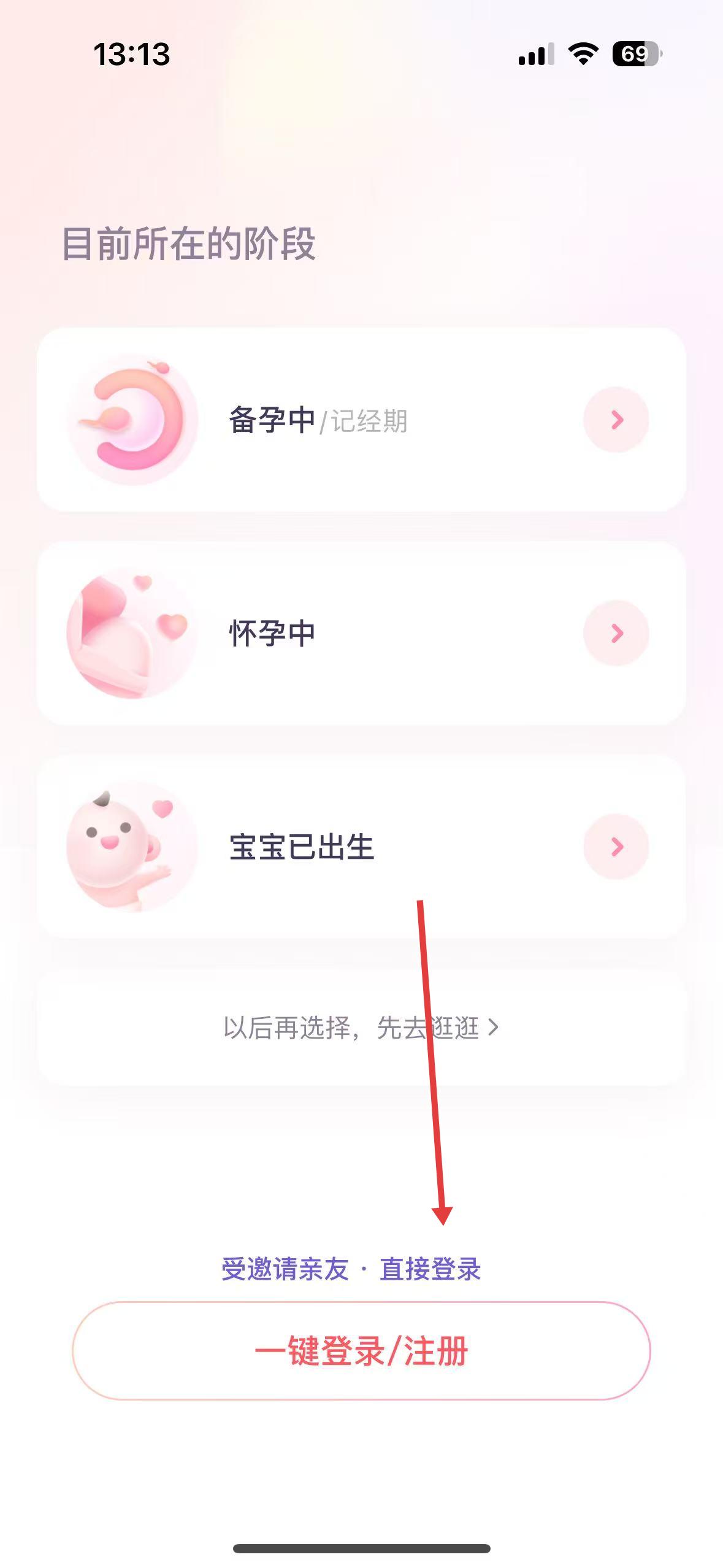 2、選擇階段頁面,有備孕中、懷孕中、寶寶已出生等選項,也可暫不選直接逛逛,還能一鍵登錄、注冊。