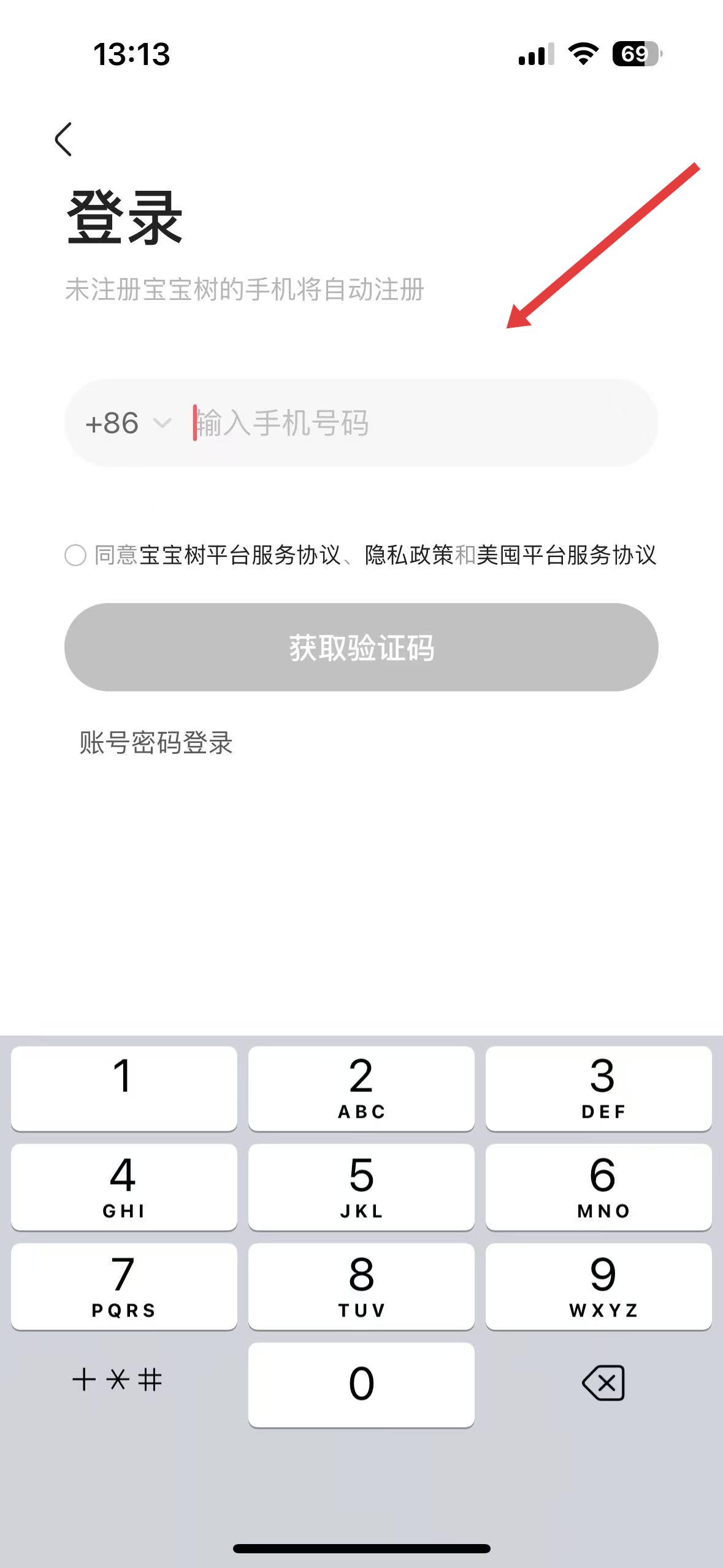 3、登錄頁面,需輸入手機號,勾選同意協議后獲取驗證碼,也可賬號密碼登錄,完成注冊或登錄流程。