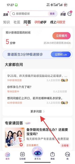1、進入問答頁面,看到專家請回答板塊,點擊該板塊,進入專家直播或相關內容頁面。