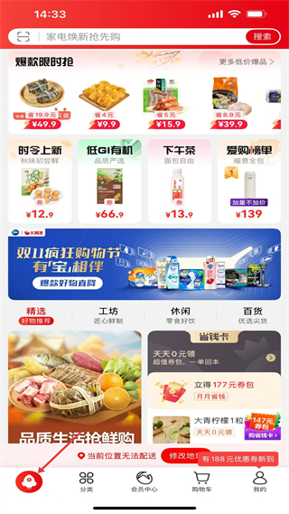 1、首頁有爆款搶、多主題板塊,雙11爆款直降,還有好物推薦、省錢卡,底部設分類、會員中心等導航欄。
